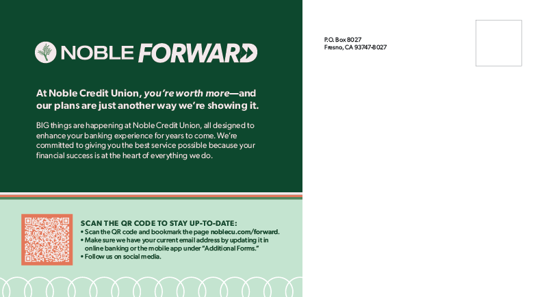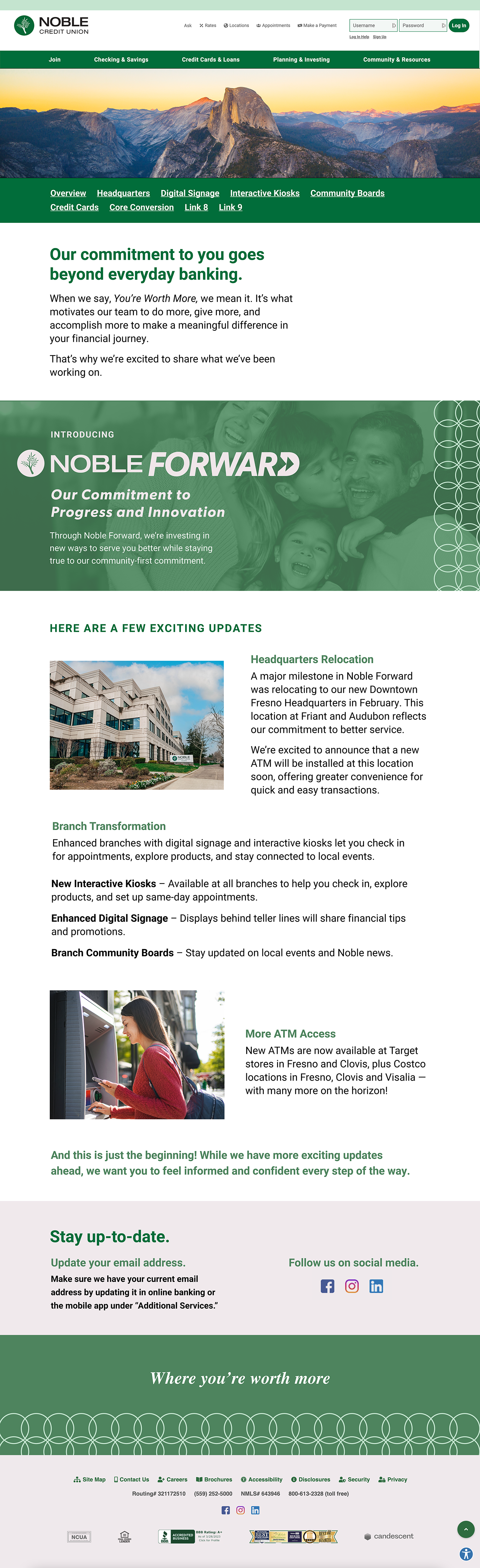 Created Noble Forward, a brand platform establishing common language and a centralized information hub for all four organizational initiatives. Sourced, vetted, and onboarded a creative agency to develop the platform's name, visual identity, messaging, and positioning with an approachable, empathetic, and helpful tone. Consulted with credit unions that had completed similar conversions to identify and avoid common pitfalls. Developed comprehensive member resources including a landing page serving as the single source of truth, print materials, and a 32-page System Upgrade Guide explaining what would change, when, and who would be affected. Hosted six branch open houses for members to speak directly with experts. The same materials and approach were used to train frontline staff, ensuring consistency across all member touchpoints.